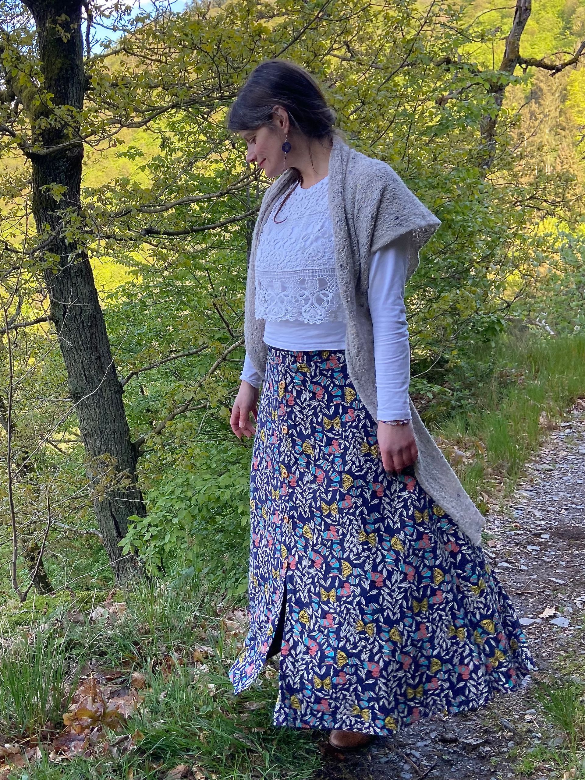 Von ihrer schön und übersichtlich gestalteten Website ließ ich mich führen. Und schnell war klar, ein langer Schmetterlingsrock, handgenäht von Anna selbst, sollte es werden. Von meiner Bestellung, über den durch und durch handwerklich präzisen Prozess von Anna, bis ich ihr liebevoll verpacktes Päckchen in der Hand hielt: In allem ist Anna lebendig, sie versprüht ihre Schöpferkraft und ihre Werte. In jedem Kleidungsstück ist ihre schamanisch geprägte Energie, ihre Liebe – zum Material und zur weiblichen Kraft vernäht. Katrin